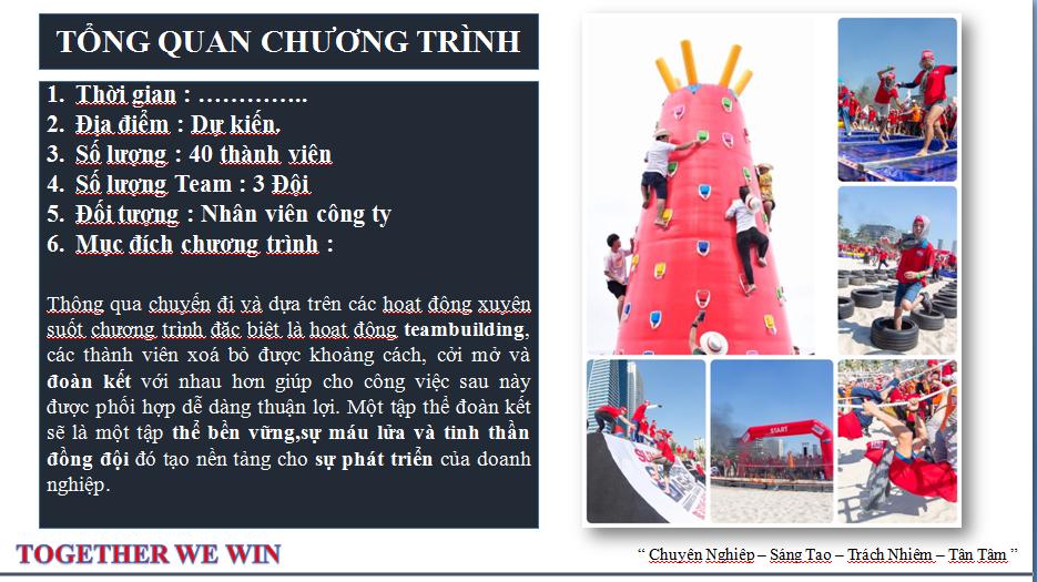 Kịch bản team building là kịch bản bao quát toàn bộ của một chương trình team building. Bao gồm các hạng mục: Thời gian, thời lượng, nội dung chính, tên người phụ trách nhiệm vụ có thể là cá nhân hoặc tập thể,…được sắp xếp theo trật tự thời gian, không gian và quá trình thực hiện chương trình.